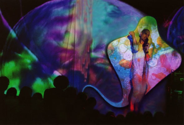 Surrounded by suspended animation pods, TJ as a psychedelic stingray serenading newly-hatched Cinderella sirens from the lost city of Atlantis, "You know, you've got that preciously prismatic Venus De Milo rainbow glow...harmonizing in a kaleidoscopic calliope of cacophonous color." Walker's Point Center For the Arts, Local Solo, April 6, 2001. Photo: Doug Krimmer. |